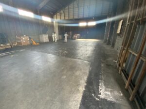 「長年倉庫を使用しており土間がボコボコになってリフトで通りずらいので土間の打ち替えをして長く使っていきたい」とお客様の考えがあり、施工させて頂きました。